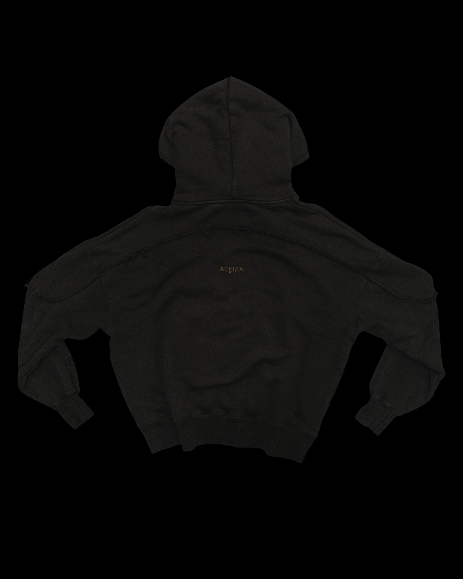 HAND DYED IN LONDON 50% BLACK. PLASTISOL PUFF PRINT CIRCLE OF GROWTH SYMBOL ON CHEST AREA WITH RAW CUT SEAMS CIRCULATING AROUND THE UPPER BODY. AELIZA WORD MARK PLASTISOL PUFF PRINTED ON THE BACK.