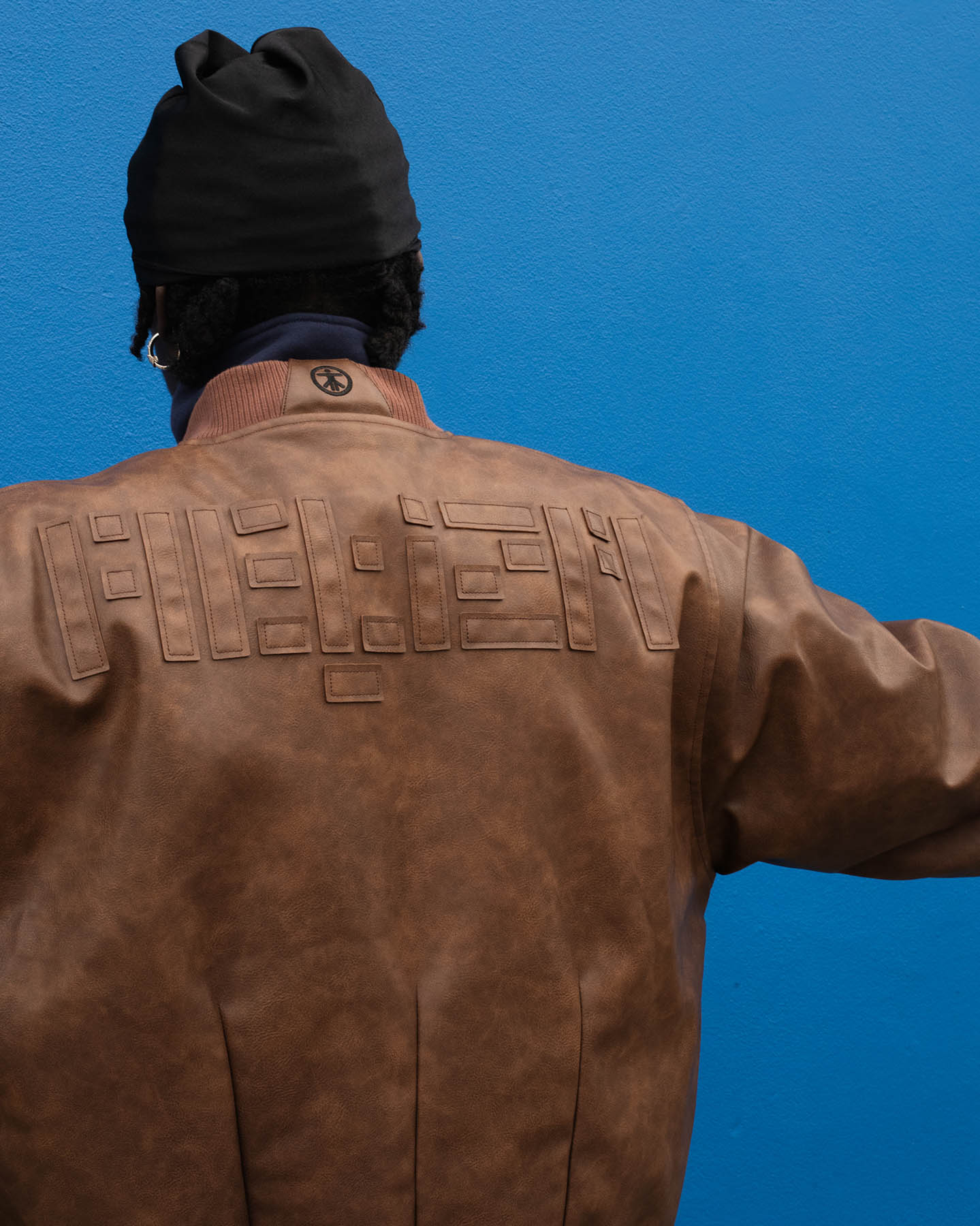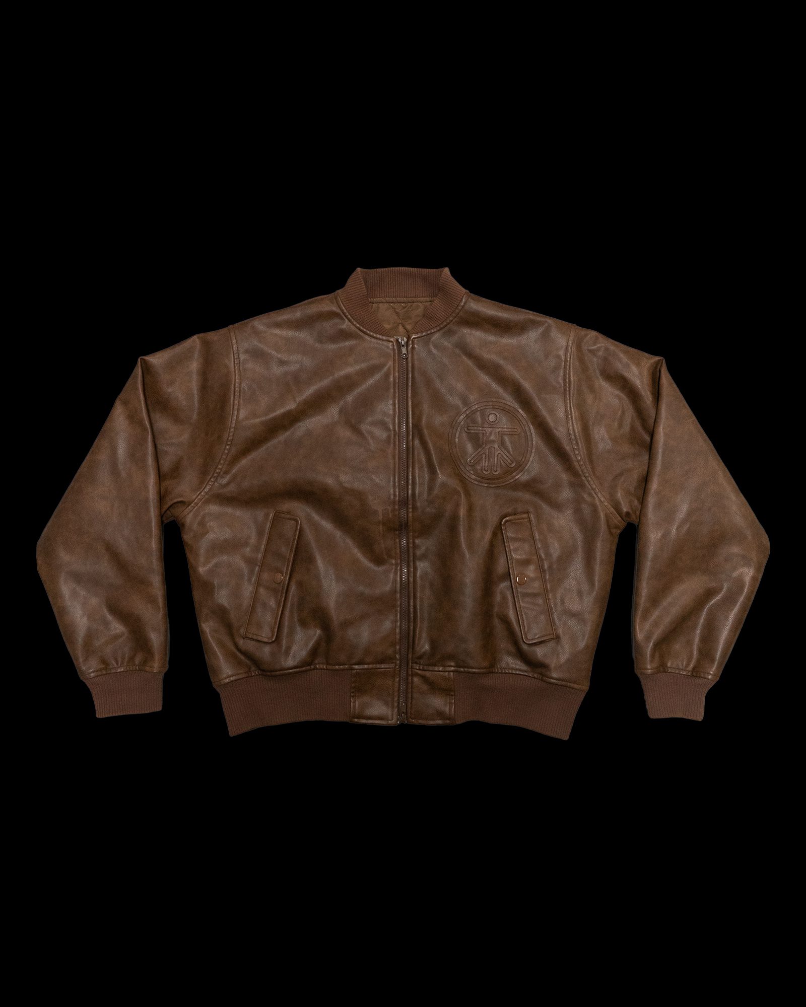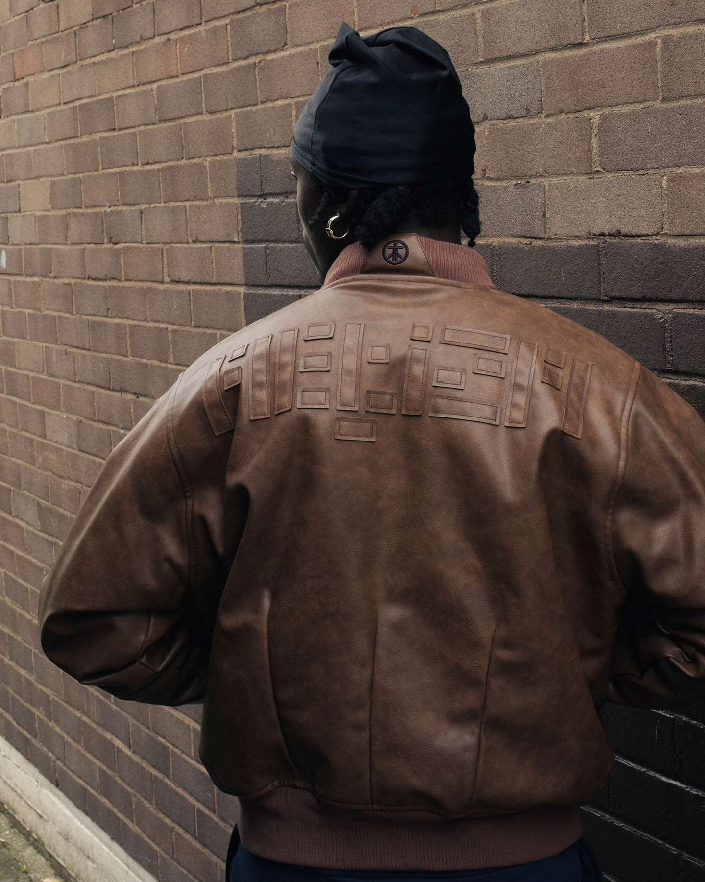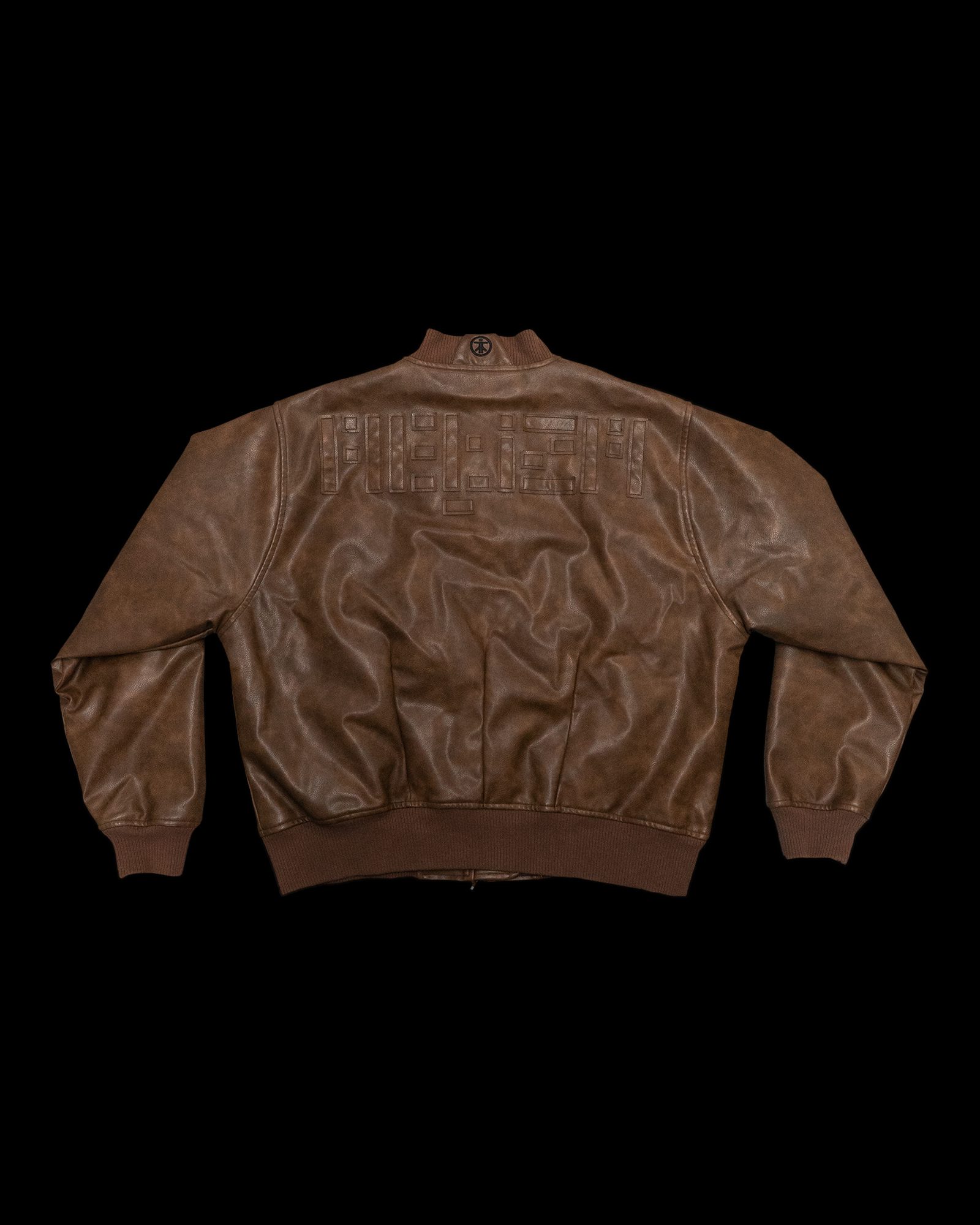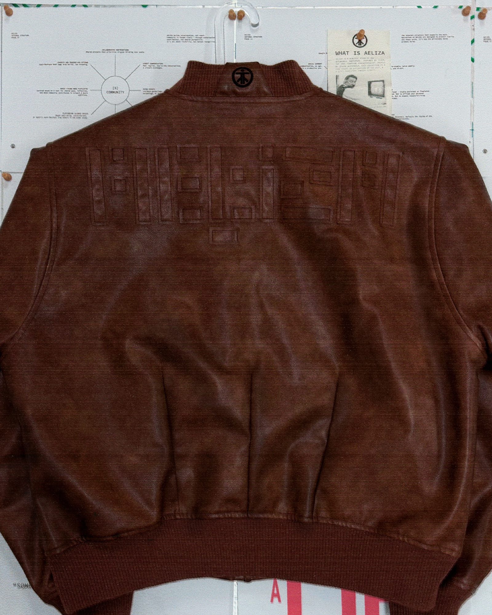QUILTED LINING, DOUBLE ZIP CLOSURE, SNAP-FLAP WAIST POCKETS, AND A LEATHER NECK PANEL. EMBROIDERED SYMBOL AT THE BACK NECK, WITH AN ADDITIONAL SYMBOL ON THE INTERNAL STORM FLAP. APPLIQUÉD INDIVIDUAL SYMBOL ON THE FRONT, AND MIT-INSPIRED TYPOGRAPHY ON THE BACK, REFERENCING ELIZA (MIT, 1966). THIS WAS THE FIRST CASE STUDY 3 SAMPLE. SMALL LEATHER COLOUR DISCREPANCY ON THE CENTRE-LEFT MID SECTION. NECK LABEL READS “LARGE”, BUT FITS A TRUE MEDIUM.